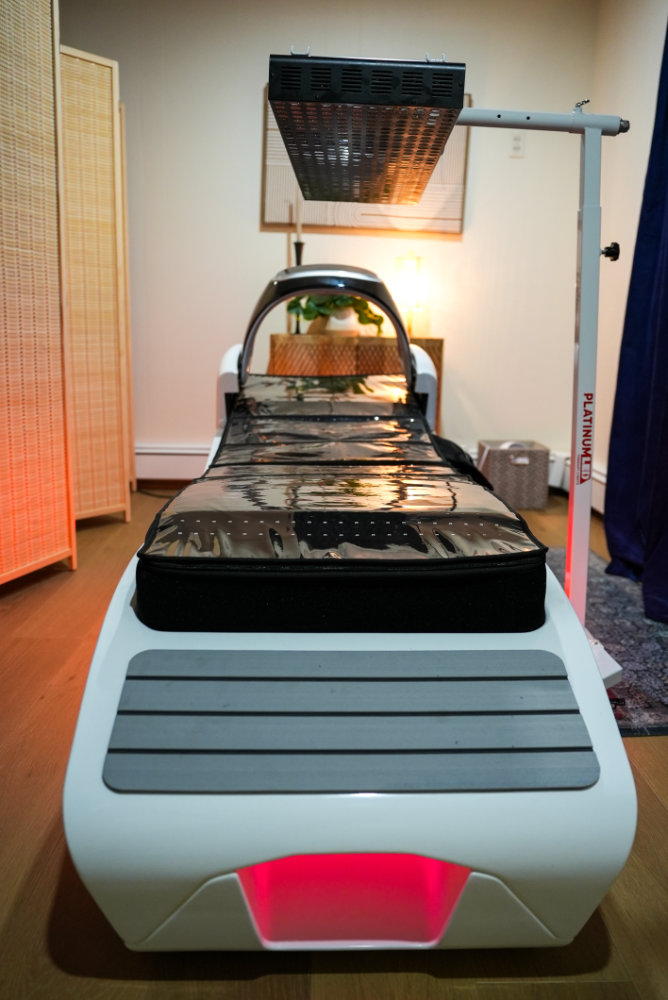 VACUACTIVUS Infracouch Grand – 35 minutes A full-spectrum light and heat therapy experience designed to support circulation, detoxification, body contouring, skin vitality, and mood enhancement. Includes BIOMAX Pro Platinum LED with targeted red and near-infrared light therapy powered by the R+ | NIR+ spectrum.